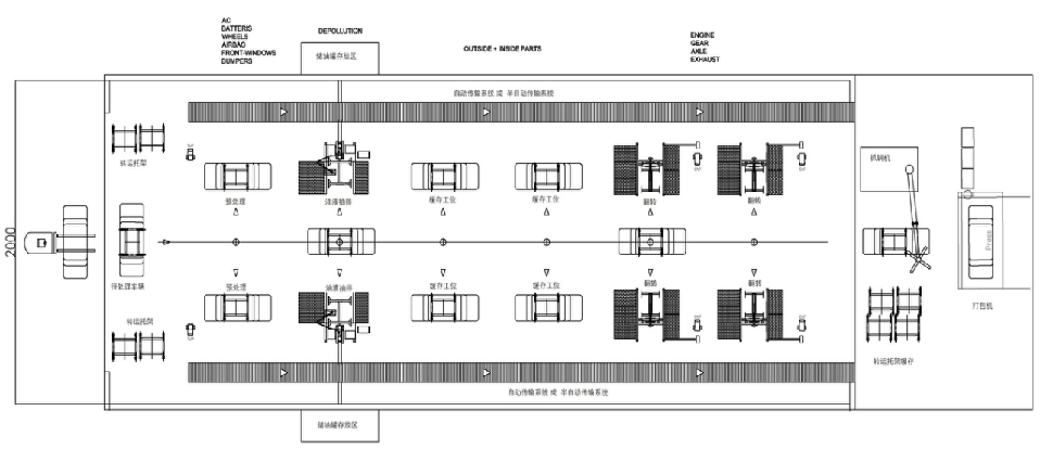北京朋米公司的柔性拆解工藝(報(bào)廢汽車(chē)拆解柔性生產(chǎn)線(xiàn)),最大限度地減少了拆解過(guò)程中的轉(zhuǎn)運(yùn)等待時(shí)間,減少車(chē)間的安全隱患,大大提高了車(chē)輛拆解車(chē)間的工作效率。同時(shí),減少了常備工人的數(shù)量,實(shí)現(xiàn)了彈性生產(chǎn),進(jìn)一步提高了企業(yè)的利潤(rùn)率。