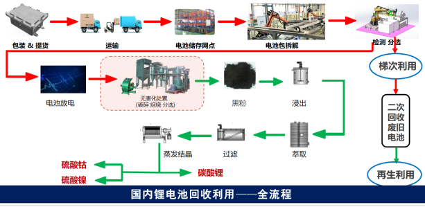 而對于重度報廢電池,電池性能下降到原性能的30%以下(根據電池情況可能50%以下),一般采用再生利用的方式,通過拆解再生,通過化學方法提取回收其中的電極材料,尤其是鈷、鎳、鋰等貴金屬。